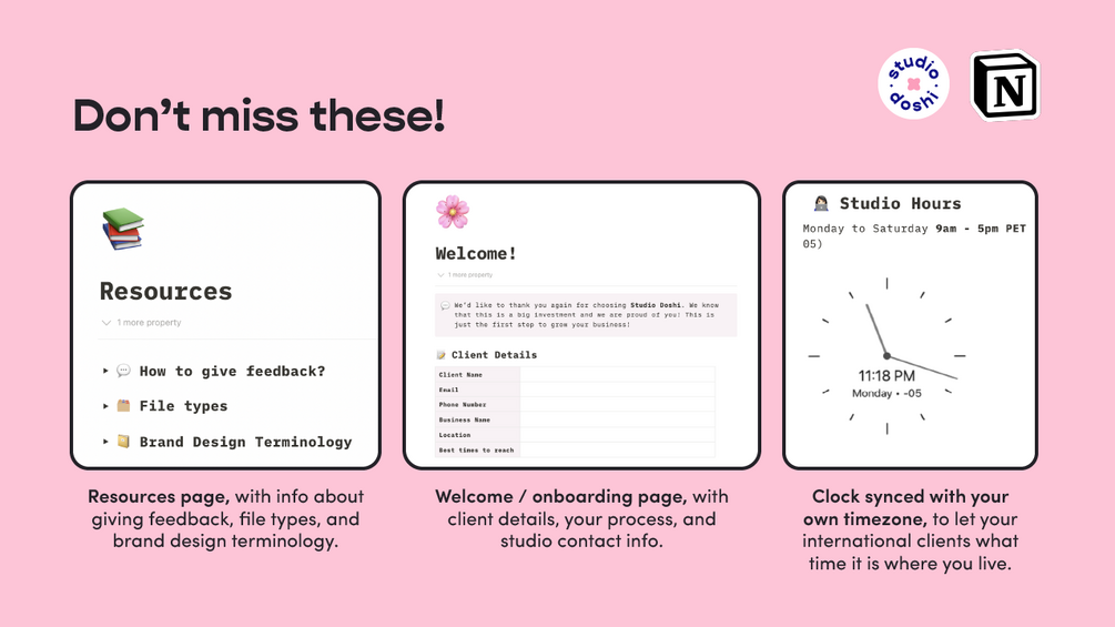 • Welcome / onboarding section - Keep track of your client’s info, introduce your own process, and leave your contact info (including a customizable clock that adapts to your timezone!)