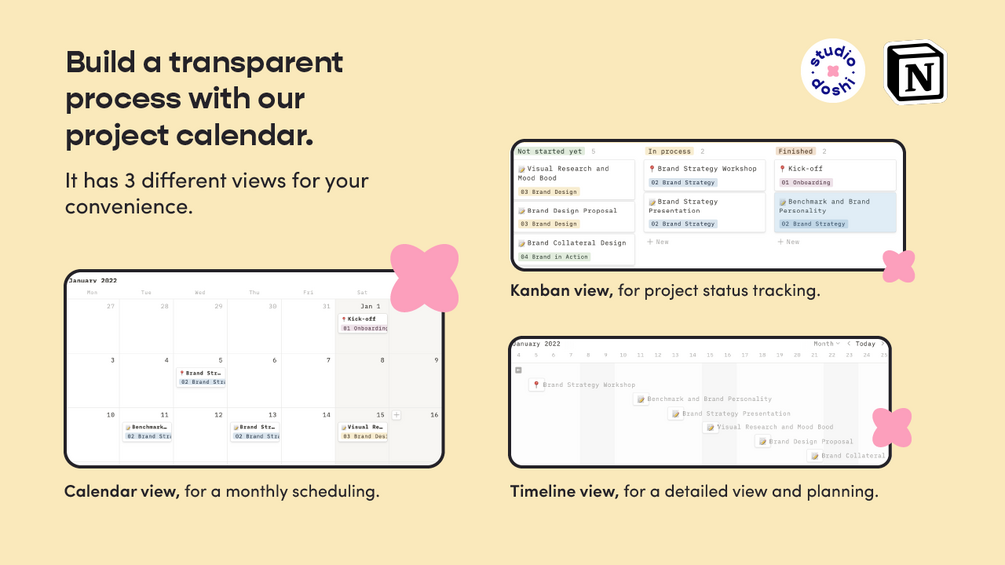 • Project Calendar - It includes 3 different views: calendar view, timeline view, and the kanban view. You can use smart tags to filter and sort your deliverables. You can add the final files in each of the tasks and ask your client to leave their feedback.